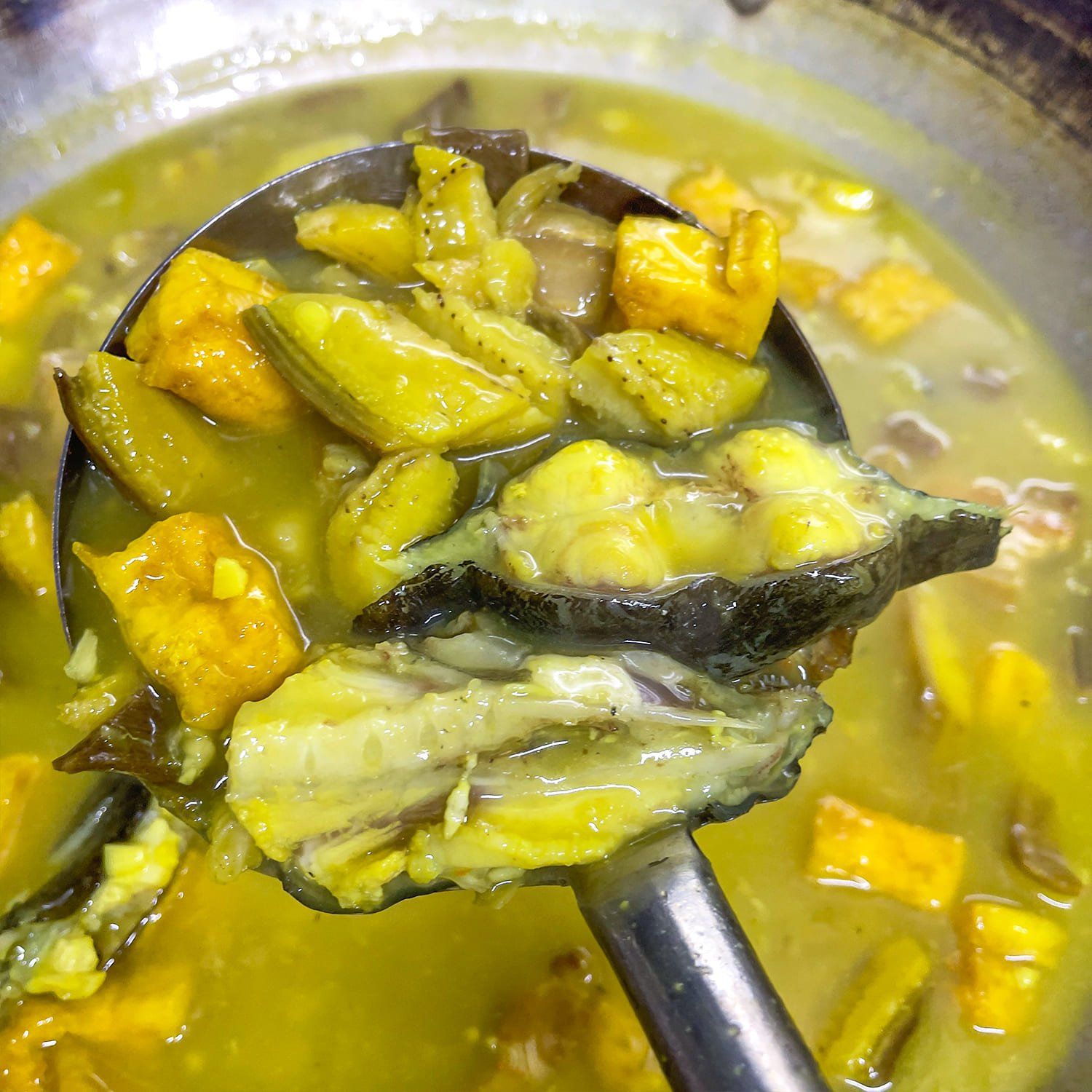 Thành phẩm món ăn không chỉ có màu sắc bắt mắt mà hương vị cũng vô cùng tuyệt hảo. Thịt cá mềm, ngọt, hơi dai, hoà quyện với nước om béo nhẹ. Chuối xanh bùi bùi và đậu chiên giòn thấm nước sốt khiến món ăn trở nên tròn vị hơn bao giờ hết.